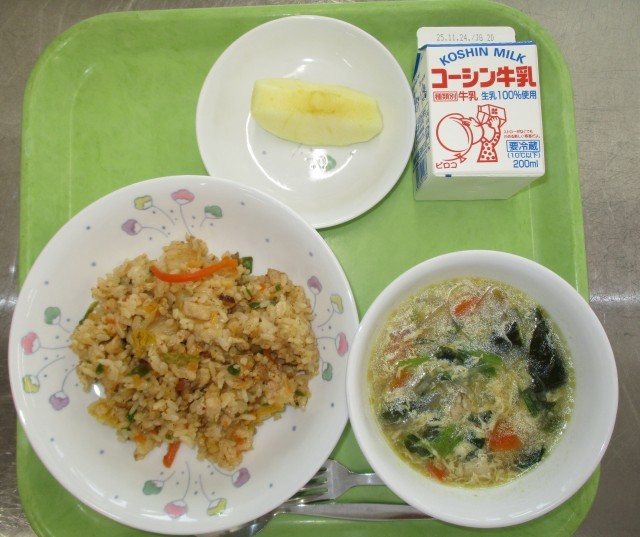 キムチチャーハン・卵と春雨のスープ・りんご・牛乳