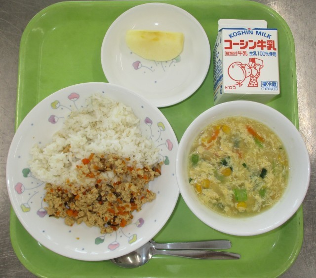 高野豆腐のそぼろ丼・卵とコーンのスープ・りんご・牛乳