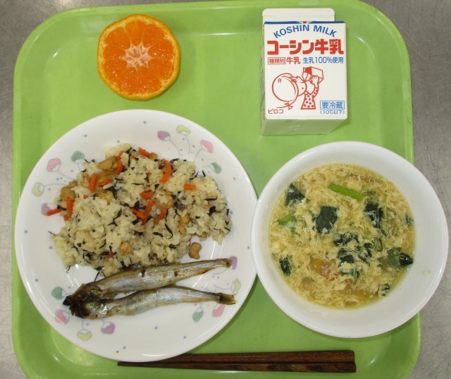 磯おこわ・ししゃもの香味焼き・かきたま汁・牛乳