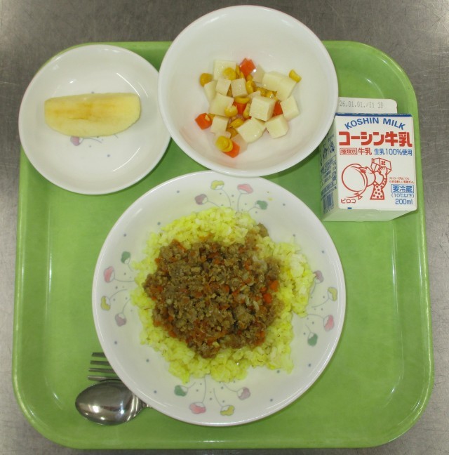 ドライカレー・かぶ入りさいころサラダ・りんご・牛乳
