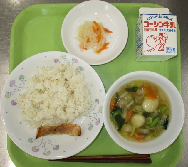 ごはん・赤魚の照り焼き・紅白なます・白玉汁・牛乳