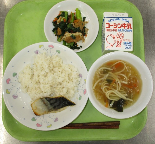 ごはん・鯖の塩こうじ焼き・生揚げと青菜の煮びたし・うどん入りすまし汁・牛乳