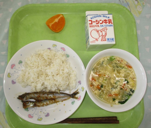 ごはん・ししゃものピリ辛焼き・卵スープ・オレンジ(鏡柑)・牛乳