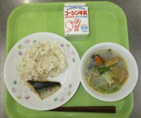 きのこのスープスパゲッティ 和風サラダ ココアケーキ 牛乳