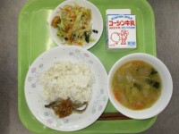 コーンごはん・ひじきの春巻き・五目スープ・牛乳 千葉県天津わかしお学校との交流給...
