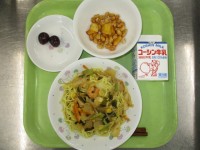 ごはん・四川豆腐・もやしときゃべつのナムル・ぶどう・牛乳 給食でも秋の味覚がたく...