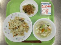 ジューシー(沖縄風炊き込みごはん)・おひたし・イナムドゥチ・牛乳 沖縄の郷土料理...