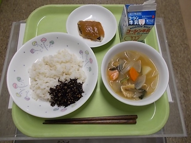 給食ではふりかけも手作りしています。今日はひじきふりかけです。ひじき、白ごま、かつおぶしに甘辛の調味料で味をつけます。とても健康的なふりかけになっています。