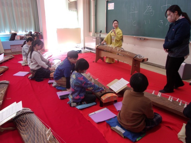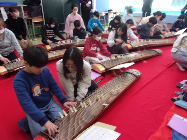5時間目に4年生が箏の体験学習を行いました。公益社団法人日本三曲協会の方々にご来校いただき、箏の仕組みや音の出し方について教えていただきました。児童は実際に爪を付けて弦をはじき、「さくらさくら」の途中まで演奏する体験を通して、箏ならではの美しい音色や響きの凄さを感じている様子でした。最後には講師の先生方が演奏を披露してくださり、児童はその迫力ある演奏に思わず見入っていました。日本の伝統文化に直接触れることができた、貴重な学びの時間となりました。