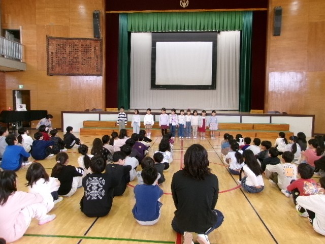 本日、全学年が集まり対面式が行われました。1年生が入場すると、2~6年生から大きな拍手が送られ、温かな雰囲気の中で式が始まりました。1年生は上級生に対して「よろしくお願いします」と伝えることができました。