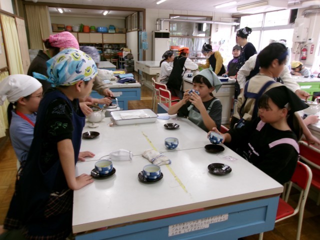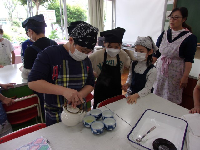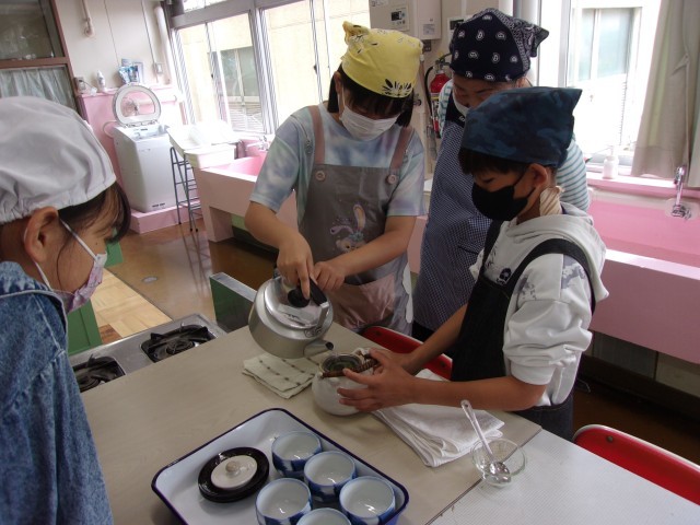 5年生から始まった家庭科の学習に、子どもたちは興味津々の様子です。今日は、初めての調理実習を行いました。地域ボランティアの多田様にお手伝いいただき、急須を使って丁寧にお茶を入れました。自分たちの手で入れた煎茶を味わい、「いつも飲んでいるお茶よりも香りがたっていて美味しい」と笑顔で話す姿が印象的でした。お茶一つで心が和む、素敵な実習の時間となりました。