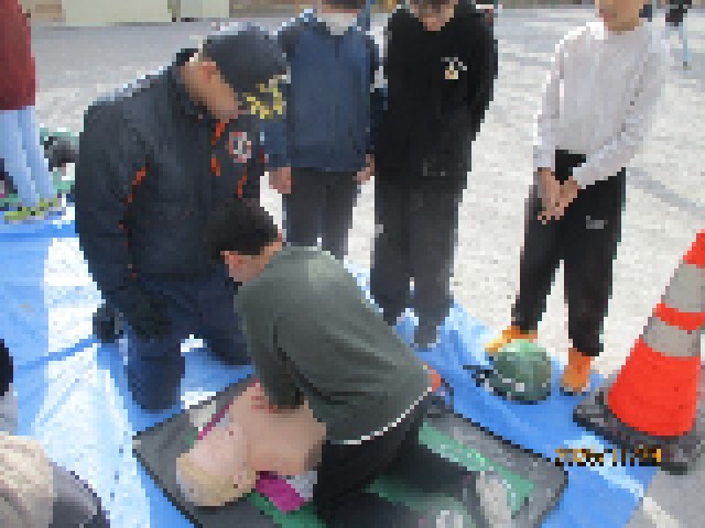 避難訓練の後、5・6年生は地域防災訓練に参加し、心肺蘇生や起震車など、様々な活動を体験しました。