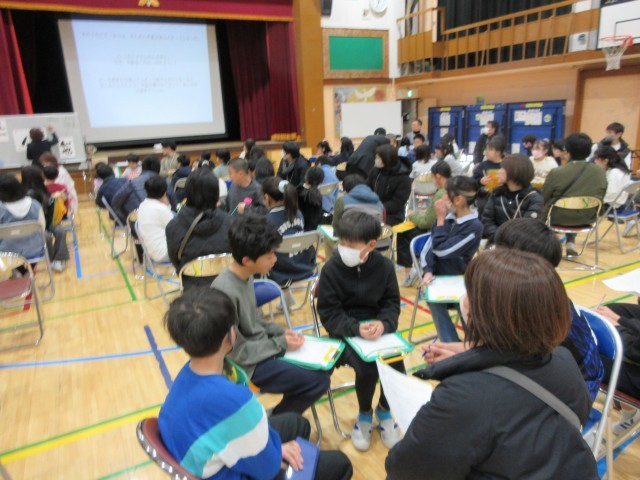 保護者の方にもグループに入っていただき、題材についての意見の交流をしました。
