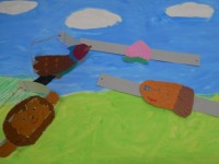 図工の時間に、アジサイの壁面かざり作りをしました。1~5年生で、葉っぱ、カエル、カタツムリ、雨雲、雨のしずくを描いたり色を塗ったりしました。お手本を見て形を捉えたり、はみ出さないように気を付けて色を塗...