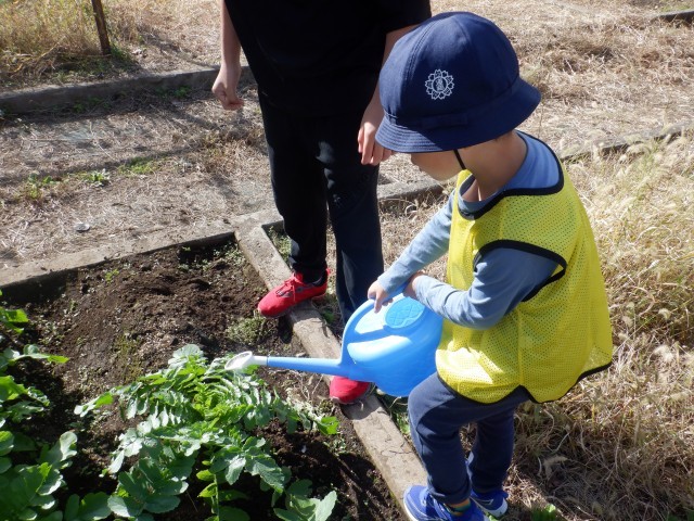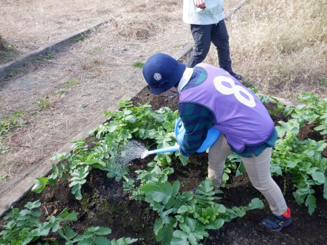 12日(水)、週に1回の水やりをしました。大根が日に日に生長しています。休み時間に草むしりを率先して行う児童もいます。あと1ヶ月くらいで収穫できます。