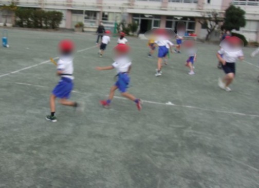 校庭の体育では、たくさん走って身体を温める「タグ取りおに」を続けています。