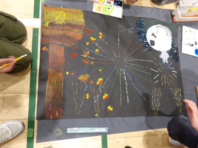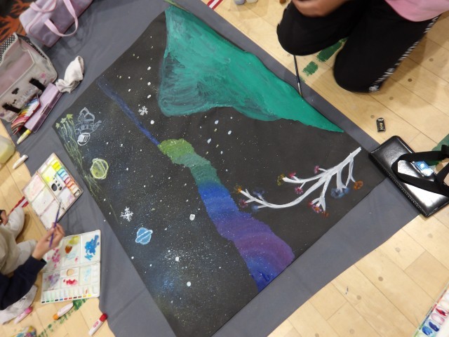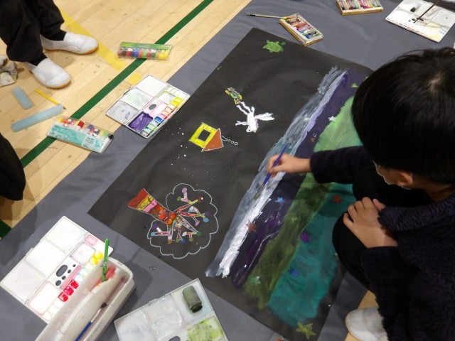 「きらめく夜空」をテーマに、それぞれの班で絵を描きました。
