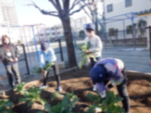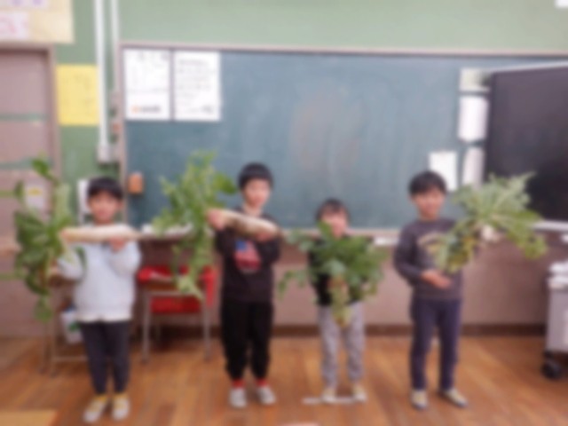 9月中旬から育てていた大根を収穫しました。子供たちは、葉っぱも食べられることに驚いていました。