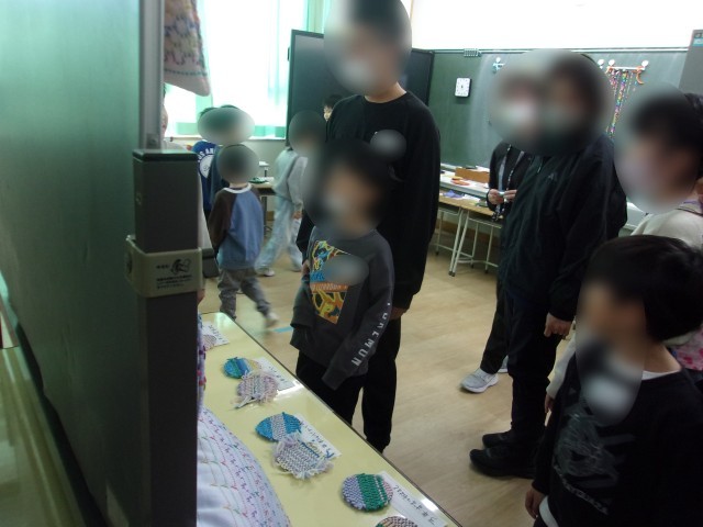 体育館では「なべなべ」などのレクリエーションを楽しみ、その後、ミニ展覧会として図工や生活単元での作品を見せてもらいました。