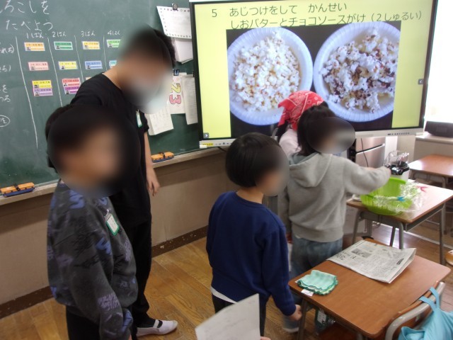 縦割り班に分かれて役割を決め、粒を機械に入れたり、出てきたポップコーンをボウルで受けたりしました。