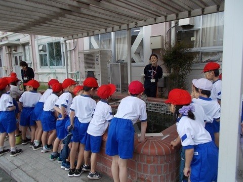 校庭では池のまわりに集まり、亀や鯉、メダカの様子を興味深く観察していました。小さな発見に目を輝かせる姿が、とても微笑ましかったです。
