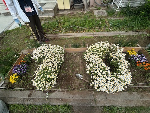 丁寧に草を取り、土を整えながら、今年度70周年を迎える本校のために、ノースポールで「70」の文字を形作ってくださいました。白い花がやさしく並び、学校の節目を彩る素敵な花壇となっています。
