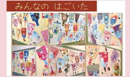 図工の時間に、羽子板に絵を描きました。はじめにクレヨンを使って好きな絵を描き、その上から絵の具で色をつけました。2学期から始めた絵の具の使い方も、ずいぶん上手になってきました。2021年のスタートにふさわしい、とても華やかなみんなの羽子板が、廊下に飾ってあります。