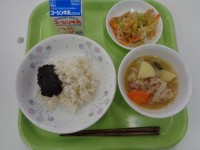 ○ガーリックライス、クリスピーフィッシュ、野菜スープ、牛乳クリスピーフィッシュは、銀ひらすという魚にコーンフレークをまぶして油で揚げました。コーンフレークのザクザクとした食感に、驚く子もいました。野菜...