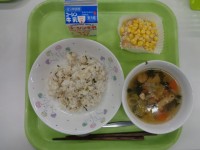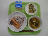 ○わかめごはん、とり肉の塩ねぎソース、土佐酢和え、もずく汁、牛乳