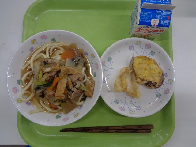 ○かけけんちんうどん、きすとさつまいもの天ぷら、牛乳