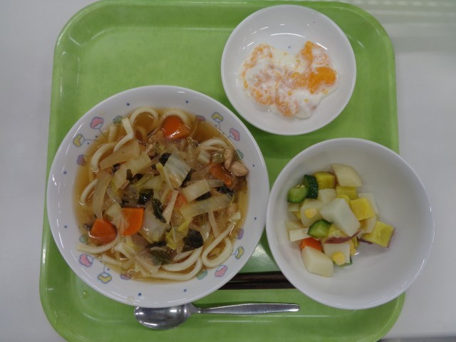 ○あんかけうどん、さいころサラダ、フルーツヨーグルト、牛乳