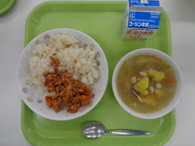 ○ガーリックライス、ポークチャップ、野菜スープ、牛乳