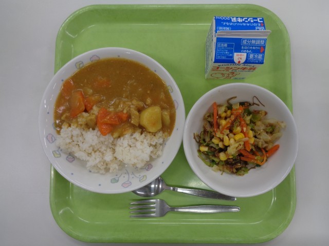 ○チキンカレーライス、りっちゃんの元気サラダ、牛乳