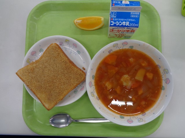 ○セサミトースト、レンズ豆のスープ、国産オレンジ、牛乳