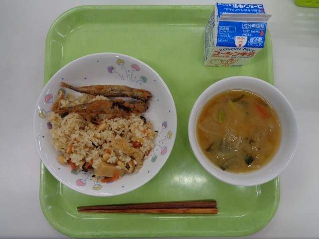 ○五目ご飯、ししゃもの唐揚げ、いものこ汁、牛乳