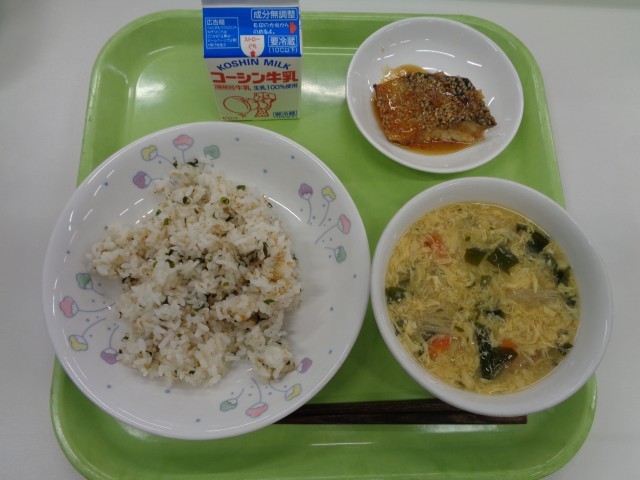 ○わかめご飯、さばの韓国風焼き、卵のすまし汁、牛乳