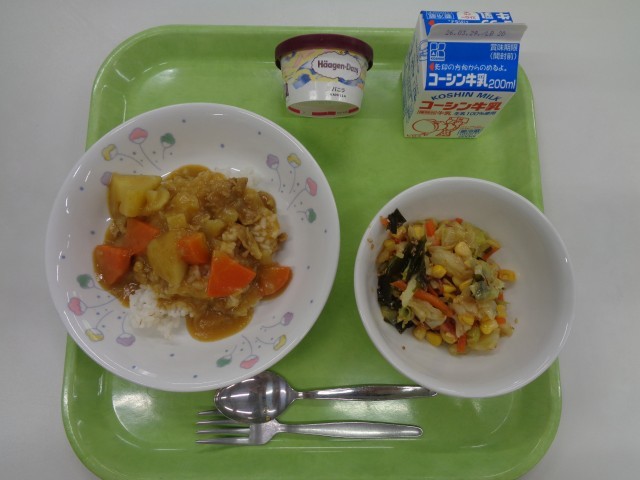 ○カレーライス、海藻サラダ、アイスクリーム、牛乳