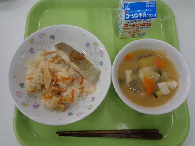 ○たけのこご飯、沖目鯛のしょうが風味焼き、いものこ汁、牛乳