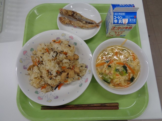 ○磯おこわ、ししゃもの唐揚げ、かきたま汁、牛乳