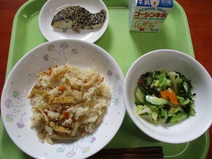 牛乳 たけのこごはん 魚の南部焼き 和風サラダ です。