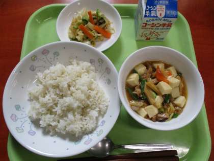 牛乳 ごはん 四川豆腐 切干し大根入りサラダ です。
