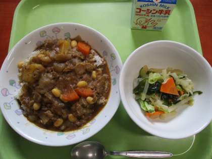 今日は暑く食欲が低下しがちでしたが、カレーだったのでどのクラスもよく食べていました。大豆とひよこ豆が入っているのでよく噛んで食べる子が多かったです。