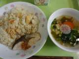 すまし汁に祝の字が書かれたなるとを入れて、給食でもお祝いです。 -