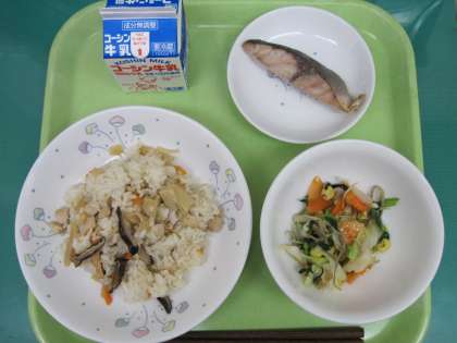 鶏おこわ イナダのしょうゆ麹焼き 根菜のパリパリサラダ 牛乳