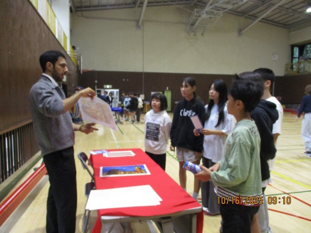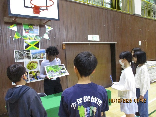 「外国語に触れる機会の創出事業(イングリッシュ・キャラバン)」として5名のALTが来校し、体育館で4年生から6年生の子どもたちと一緒に「ワールド・ツアーに出かけよう」の学習活動を行いました。パスポートを持って各旅行先を回り、旅行先担当のALTから出された質問やクイズに答え、世界旅行をする活動を行いました。ALTに何とか伝えたいことが伝わるようにジェスチャーを加えたり、知っている言葉で分からない単語を言い換えたりする様子が見られました。普段学習している英語は、実際に授業外で使う機会は、少ないと思います。今回のように英語でのみ、やりとりができる環境に遭遇することで、子どもたちは一生懸命考え、行動する様子が見られました。日本では見られない自然や野生の生き物、伝統料理などを紹介していただき、驚いている様子も見られました。