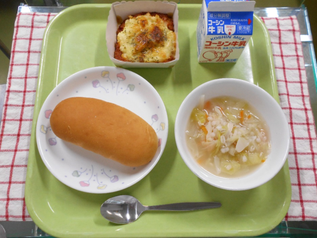 今日はイギリス料理献立です。シェパーズパイは羊の肉で作ったミートソースをパイ生地ではなくマッシュポテトをかぶせた料理です。給食では豚肉のミートソースで作りました。児童からは大好評でした。スコッチブロスは肉や野菜と麦などの穀物を入れたスープです。お米だと思った児童も多かったですが、押麦を入れました。