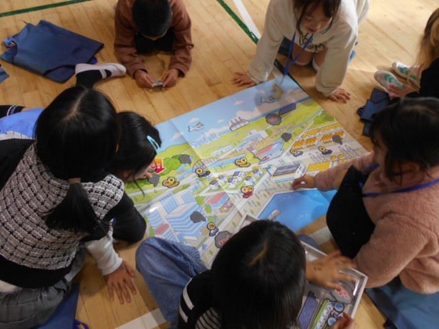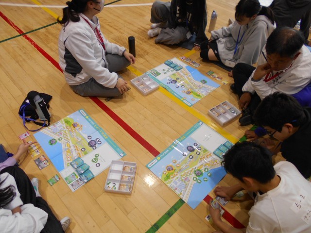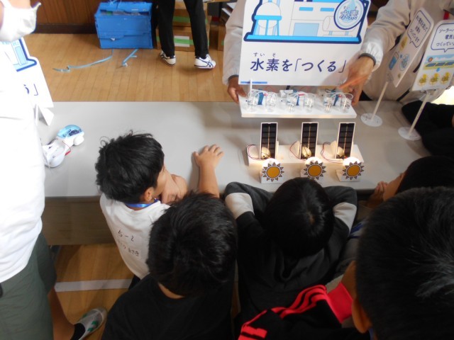 11/6(木)にトヨタの方をお招きして授業を行っていただきました。内容は「カーボンニュートラル」についてです。カーボンニュートラルとは、人間の活動によって排出される温室効果ガスの排出量と、森林などによる吸収量を差し引きして、全体として排出量を実質ゼロにすることです。水を電気分解し、水素を作っている様子や、その水素を使って動くミニカーを走らせたり、二酸化炭素を使用しない町作りなどについて、マグネットを動かしたりゲームをしたりしながら体感的に学ぶことができました。