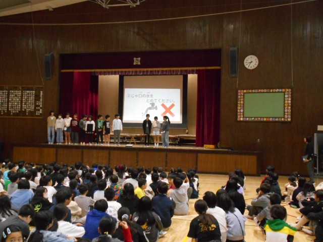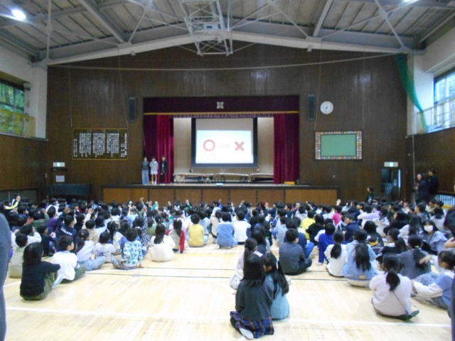 普段どんな仕事をしているかを説明した後、保健や給食に関するクイズを考えて出しました。