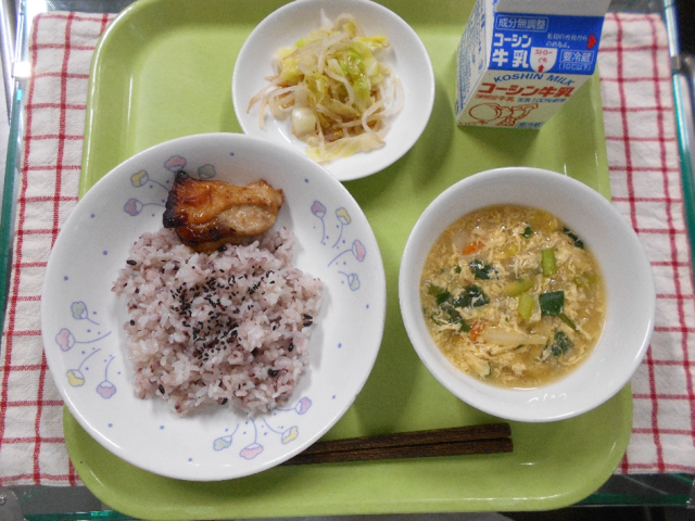 今日は七五三のお祝い給食です。七五三を終えた子が多いですが、これからも健康に成長できるように願いを込めて、おめでたいときに食べる赤飯を作りました。いつもは小豆やささげで作りますが、今回は古代米である黒米を一緒に炊きこんで作りました。