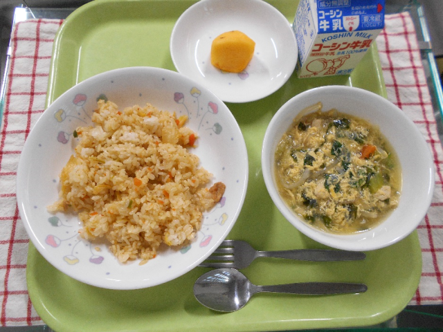 キムチチャーハンは子どもたちから人気のある料理です。豚肉やキムチを炒めてごはんと合わせます。キムチは汁を搾って使い、辛さを調節しています。低学年と高学年で辛さを変えていますが、あまり辛くならないようにしています。くだものは柿です。種のない食べやすい柿が届きました。